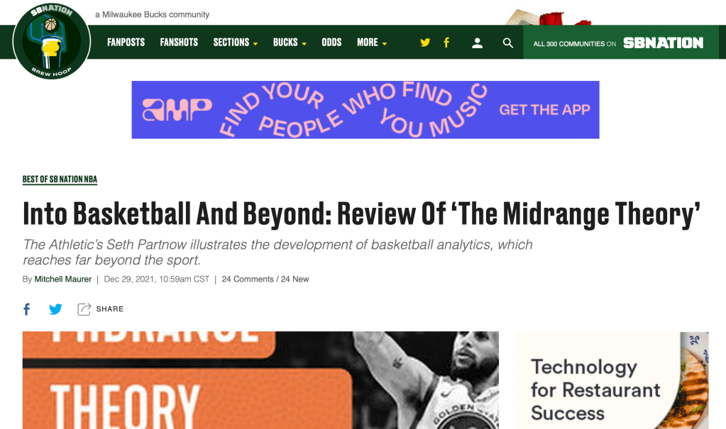 Writer, podcaster and analyst Seth Partnow is one of the leading voices in the emerging field of sports analytics. A contributor to The Athletic and former Director of Basketball Research for the Milwaukee Bucks, Partnow is the author of The Midrange Theory and Director of North American Sports for sports data leader StatsBomb.